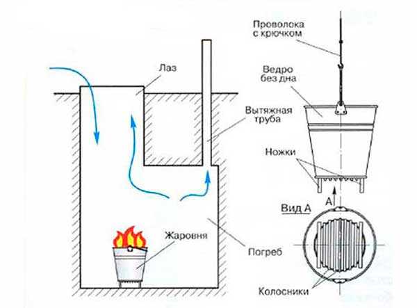 - После прогорания углей, жаровня при помощи веревки удаляется из погреба, а люк закрывается;
