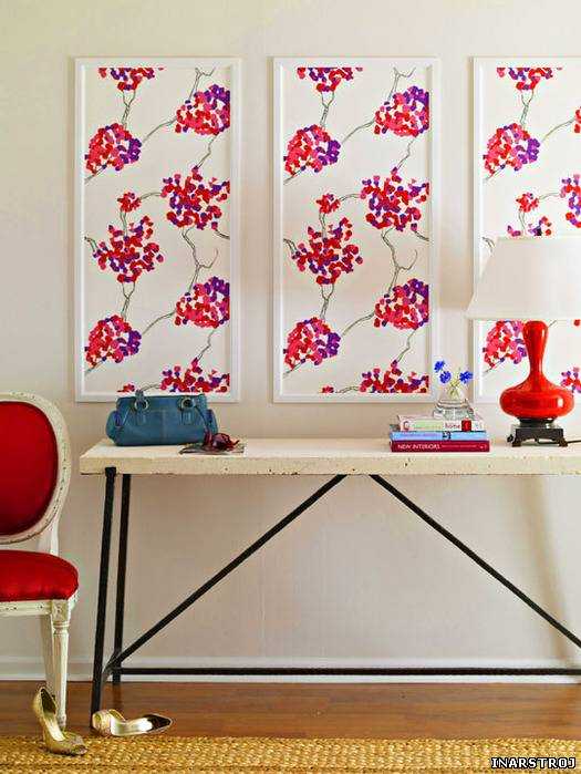 Для придания помещению завершенный вид можно использовать картины из ткани или композицию из нескольких картин с тканями различных цветов в каждой рамке. Картины должны иметь одинаковый размер, но не обязательно вешать их близко друг другу, наоборот, лучше соблюдать некоторую отдаленность.