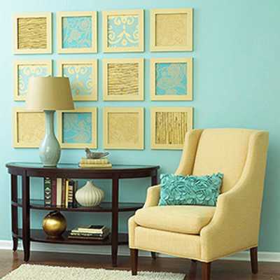 Если владелец относится настороженно к экспериментам и опасается резких перемен в помещении, то можно воспользоваться техникой настенного панно. Такие картины можно добавить в интерьер любое время и очень легко их демонтировать. Очень просто самостоятельно изготовить такой вариант быстрого декора. При этом используются любые материалы, имеющиеся под рукой. Старые рамки различных размеров обтягиваются тканью и закрепляются на стене, соблюдая определенный геометрический порядок. Можно добавить эффект ретро оформления, если заменить полотна ткани старыми фотографиями.