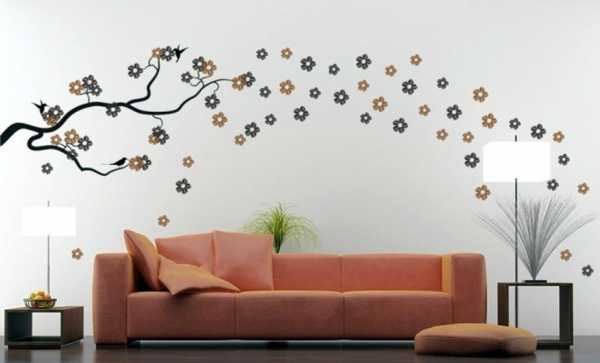 Использование трафарета позволяет изобразить любой рисунок даже тем, у кого нет соответствующих художественных навыков. Можно изобразить цветы, деревья, лепестки, звезды, фигуры птиц, силуэты людей и многое другое. Такой вариант идеален для детской комнаты. В гостиной комнате актуально будут смотреться абстрактные фигуры, рисунки музыкальных инструментов, силуэты городских достопримечательностей.