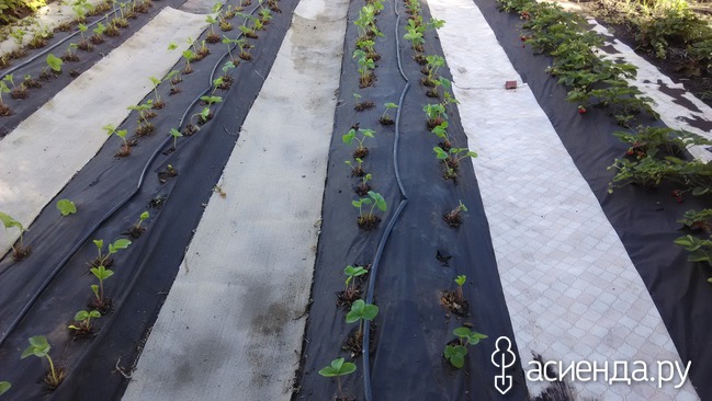 Накрытая материалом грядка клубники хорошо держит влагу и нуждается в гораздо меньшем поливе.
