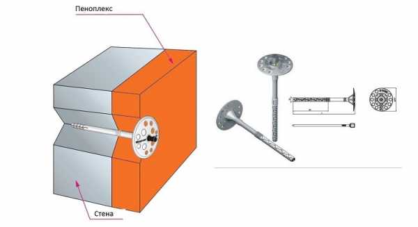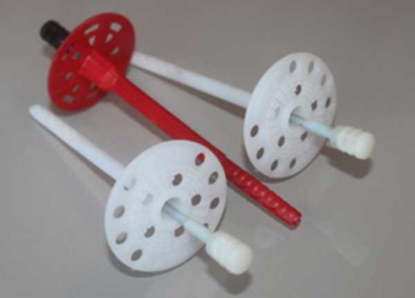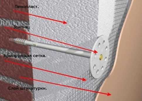 На специальные дюбеля, которые внешне напоминают грибки со шляпкой, крепят все виды утеплителей начиная от пенопласта и заканчивая минеральной ватой. Например, плиту из пенопласта, сначала крепят к стене клеем, а после фиксируют с помощью нескольких зонтов.