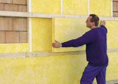 Минеральная вата. Плотность этого продукта несколько ниже, чем у пенопласта, что не позволяет использовать клей. Крепится она между стойками из обрешетки. Чтобы получить надежную фиксацию, проем между отдельными брусками должен быть несколько меньше плиты минеральной ваты. В некоторых случаях могут дополнительно монтировать и горизонтальные подпоры, чтобы образовывались своеобразные ячейки, куда и помещается продукт. Здесь также используются дюбеля, но делается это относительно редко.