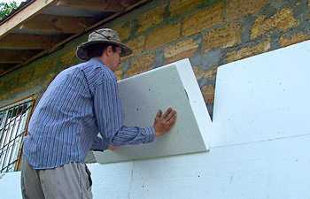 Более простой и дешевый метод утепления стен — с помощью пенополистирола (пенопласта). Его преимущество — более низкая плотность и легкий вес. Паропроницаемость пенополистирола ниже, что способствует увлажнению среды. Однако «точка росы» находится в утеплителе. Это предотвращает появление конденсата. Пожароопасность его выше, чем у минваты (подвержен термодеструкции, но огонь не распространяется). Специалисты советуют защищать области дверных и оконных проемов окантовкой из минваты. Теплопроводность пенополистирола составляет до 0,039 Вт/м 2 . К плюсам данного материала можно отнести невосприимчивость к ультрафиолету, морозу, грибкам и плесени.