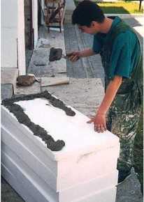 Когда клей высохнет, плиты пенопласта закрывают облицовкой, штукатуркой или сайдингом. Для оштукатуривания на поверхность плит крепится монтажная сетка. Поверх сетки наносится цементная «шуба».