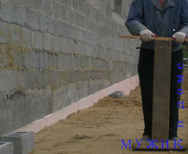 - На уплотненный слой глины укладывается песок. Толщина слоя песка около 10 см. Слой песка необходимо выровнять и тщательно утрамбовать. Чтобы уплотнение было эффективным, песок в процессе трамбовки необходимо проливать водой. Очень тщательно песок должен быть утрамбован у стенок фундамента.