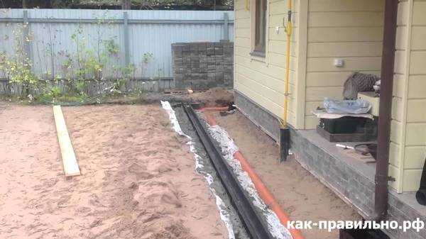 Следующим этапом является песок. Песок выбирается хорошего качества, без каких-либо примесей. Слой песка не должен превышать 20 см. песок утрамбовывается, а затем обильно смачивается водой посредством шланга. Далее снова трамбуем. Данные манипуляции проводятся до тех пор, пока песочная основа не станет ровной. Когда основание готово, переходим к траншее для трубы. Она необходимо для того, чтобы дождевая вода стекала в дренажную систему.