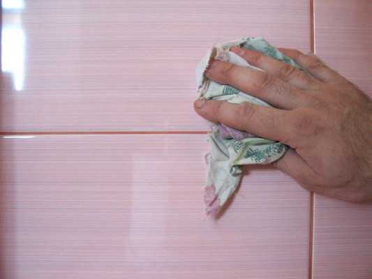 Во время затирки периодически, через каждые 15-20 минут влажным поролоном или ветошью удаляют излишки клея. Через сутки облицованную керамикой поверхность начисто протирают чистой влажной ветошью, дают плитке просохнуть, после чего своими руками полируют её сухой фланелью.