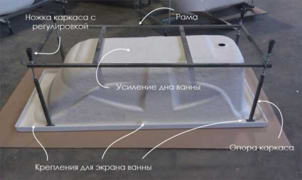 Независимо от материала изготовления, любая ванна устанавливается на сборную или сварную раму из металлических элементов. Такая рама обеспечивает фиксацию ванны на своем месте и защищает ее от запредельных деформаций при нагрузке. От качества рамы зависит итоговая стоимость всего комплекта изделия.