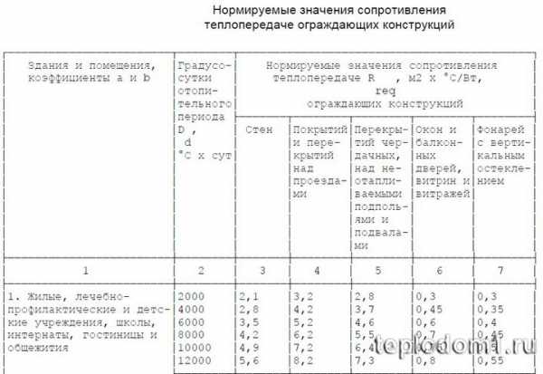 Минимальные параметры сопротивления теплопередаче для всех четырех климатических зон: 2,80; 2,50; 2,20; 2,0. Ниже приведены предельно допустимые минимальные значения сопротивления теплопередаче для разных типов помещений:
