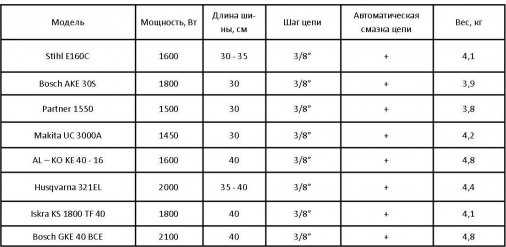 Сравнительная таблица характеристик цепных бензопил