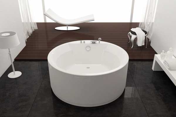 Ванны в виде квадрата или круга, а также ванны необычных сложных форм обычно располагают по центру помещения. Их выбирают в том случае, когда площадь ванной комнаты велика, и при нестандартном дизайне.