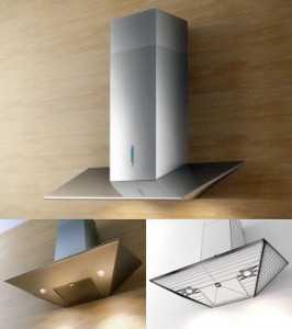 - Островная вытяжка — прочная, жесткая, здесь редки корпуса из тонкого металлического листа.
