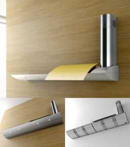 - Плоские подвесные приборы монтируются над варочной поверхностью. Над оборудованием может быть расположен шкафчик, так как нет необходимости соединять плоскую вытяжку с вентиляционным каналом. В них преимущественно установлены простейшие акриловые фильтры, адсорбирующие только жир. Для того чтобы не менять акриловый фильтр каждые 4 месяца, можно поставить в вытяжку металлический, который нужно просто периодически мыть. Плоские вытяжки — наименее мощная техника, считающаяся устаревшей.