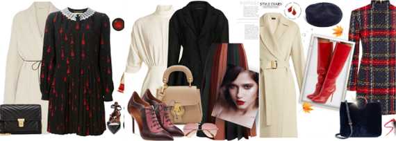 Для прохладной погоды подойдет комплект, состоящий из молочного джемпера, классических черных брюк, красных полусапожек и алого пальто. Уютно, красиво и удобно — что еще нужно для женского счастья?