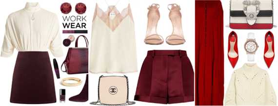 Создать воздушный ансамбль поможет шифоновая блузка вишневого оттенка, молочного цвета шорты или юбка и такого же тона пиджак. Элегантный высокий каблук завершит стильный образ.