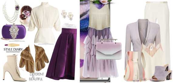 Молочно-фиолетовый разнообразит вам вечерний гардероб, ведь эти два тона так великолепно подчеркивают друг друга. А если в него добавить блеска? Коричневый, синий, теплый розовый станут хорошими спутниками такой паре.
