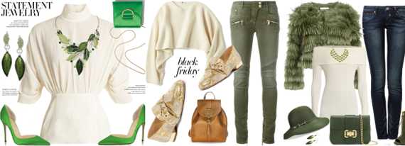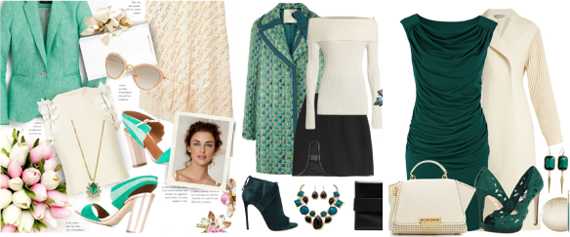 Можно создать комплект, где с молочным цветом сочетаются сразу два зеленых оттенка. Фантазируй! Или выбирай наш вариант: цвет мяты отдаем джинсам-скинни, сумке и туфлям, бирюзовый оставляем для пиджака, а в молочный пусть окрасится топ.