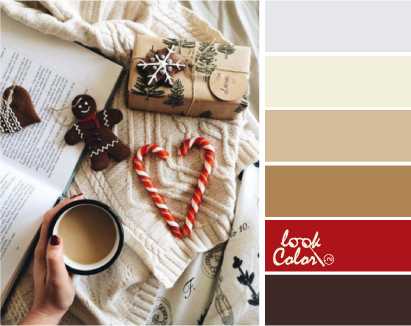 Радостное, свежее и светлое новогоднее утро подчеркнуто молочным оттенком вязанного покрывала, совмещая в себе тепло, уют, традиционность. Зеленый и красные оттенки – обязательные спутники торжества, а коричневые и бежевые тона – вкусной еды и питья. Совмещая все эти тона, мы получим идеальное впечатление Новогоднего утра. В палитре участвуют холодный белый, молочный, кофе с молоком, хвойно-зеленый, кораллово-красный, темно-коричневый.