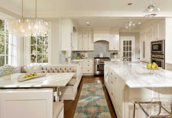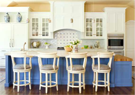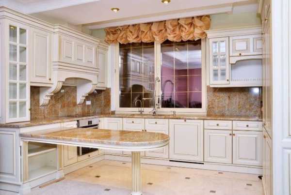 Секрет благородности молочно-белого в том, что его сложно достичь, следовательно, его производство не из дешевых. А дорогая краска пойдет к дорогому материалу. Кухонный гарнитур, поддерживающий стилистику классицизма тоже не будет из категории бюджетных. Да и для маленькой кухни он не пригоден, так как стиль требует простор и высоких потолков. Так, в такой кухне на американский манер можно разместить разделочный стол, одна сторона которого будет использоваться как барная стойка. Подберите к ней высокие стулья в этом же стиле с контрастной пятнистой обивкой. Над столом небольшие навесные светильники. Аксессуарами в такой кухни могут служить фарфоровые вазы, статуи из бронзы или под золото. Пол – доска с четким рисунком.