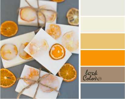 Самодельное, натуральное, эксклюзивное мыло с кусочками засушенного апельсина не только очень приятно для рук, но имеет высокую эстетическую ценность. В данном случае мягкие белые тона являются изысканным фоном для золотистых апельсиновых оттенков. Палитра состоит из мягкого белого, молочного, соломенного, янтарного, серо-бежевого, шифера.