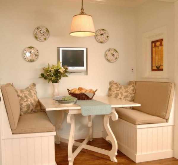 Над столом в «молочной» кухне прекрасно смотрятся яркие лампы и небольшие регулируемые светильники. В интерьере широко применяются и аксессуары – вазы, статуи под золото или бронзу. Пол лучше всего монтировать из досок с четкой структурой.