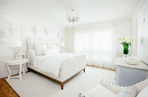 Спальня, в интерьере которой применяется молочный цвет, требует подбора особого текстиля. Насыщенного цвета шторы идеально смотрятся с белым, почти невесомым по фактуре тюлем. Шторы также должны перекликаться в интерьере спальни с текстилем, используемым для оформления кровати и декоративных подушек.