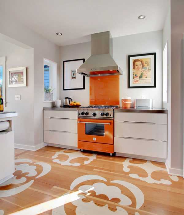 Пол на этой оранжево-коричневой кухне сделан из ламината под дерево