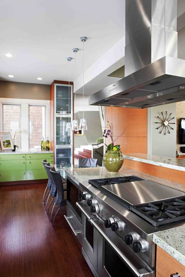 В кухне зелено-оранжевые мотивы будут располагать к хорошему аппетиту. Специалисты Фэн-Шуй считают, что если на кухне много зеленого, то захочется употреблять в пищу больше салатов, а это полезно. От себя можно додумать, что присутствие оранжевого цвета побуждает к употреблению апельсинов и мандаринов, это тоже очень полезно, главное, чтобы не до аллергии.