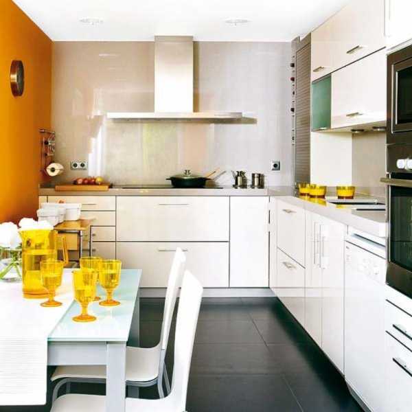 Белый цвет — как чистый лист бумаги, на котором можно нарисовать что угодно. На фоне белого оранжевый смотрится ярче, насыщеннее, выразительнее. Сочетание белых стен и яркого мандаринового гарнитура с глянцевыми фасадами может использоваться во многих современных стилях: минимализм, хай-тек, модерн. Не менее впечатляюще смотрится и белая мебель на фоне отделки стен лососевого оттенка.