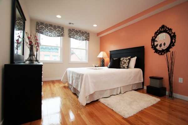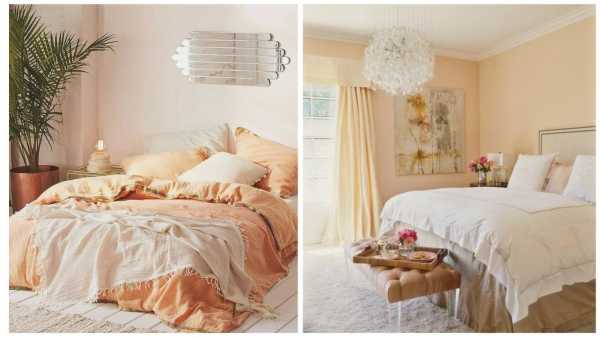 Для спальни подойдут пастельные оттенки, которые не напрягают глаз: персиковый, абрикосовый, лососевый.