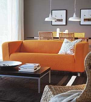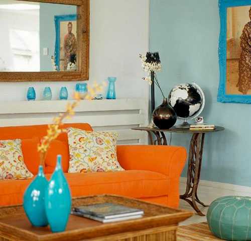 Если же вы предпочтете сделать яркий акцент на мебели, то лучшим вариантом будет оранжевый диван. Идеальным «фоном» для него будут стены белого, кремового, серого, зеленого и светлых оттенков синего цвета. При этом чем светлее обивка мебели, тем светлее должен быть и оттенок стен.