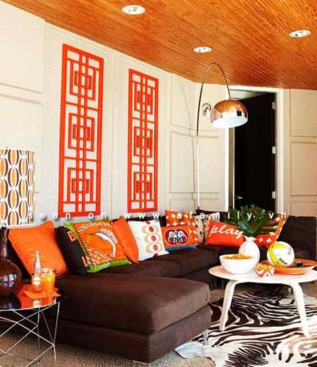 В гостиной оранжевый использует чаще в качестве акцентов – торшеров, подушек, картин, ковриков, интерьерного декора.