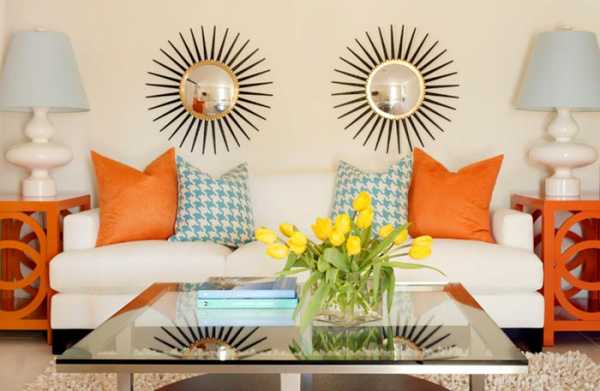 Мягкую мебель в этом случае можно выбрать в серых, бежевых или белых тонах. А дополнят интерьер оранжевые декоративные подушки и плед. Журнальный столик со стеклянной столешницей или консоль на витых ножках тоже прекрасно впишутся в такой интерьер.
