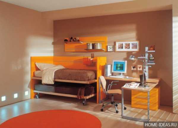 Но есть и другие варианты, например, сделать оранжевой только одну стенку, а другие в коричневых оттенках. Комната будет и теплой и спокойной одновременно.