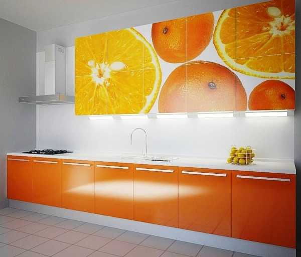 А вот фартук в оранжевой кухне вполне может быть «в тон» кухне. Особенно хорош будет фартук с фотопечатью.