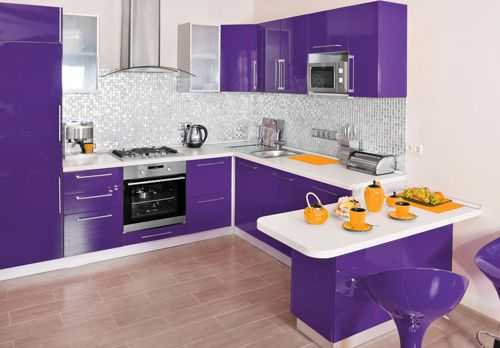 Использование оранжевой посуды в качестве декора на кухне фиолетового цвета