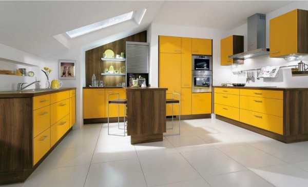 Кухня в стиле «модерн» сочетает в себе оранжевый и жёлтый цвет поверхностей шкафов
