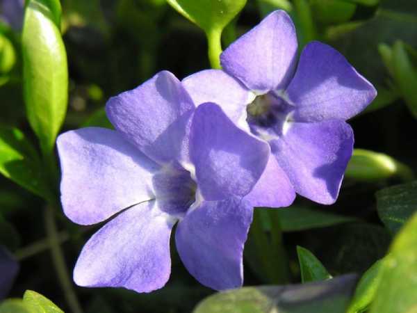 - Барвинок. Это низкорослый стелющийся полукустарник с прямостоячими побегами. Листья темно- или светло-зеленые, кожистые, некоторые сорта с белой или розовой каймой по краям. Цветы крупные, одиночные. Цвет — обычно синий, но есть белый и розовый, нежно-лиловый. Массово цветет весной, есть одиночные цветы весь период вегетации. Предпочитает хорошо дренированные рыхлые плодородные почвы с нейтральной или слабо-кислой реакцией. Тенелюбивое растение, неплохо чувствует себя и в полутени.
