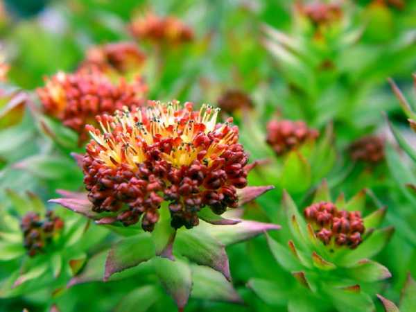 - Родиола розовая – растение, которое отличается необычными соцветиями и овальными мясистыми листьями.