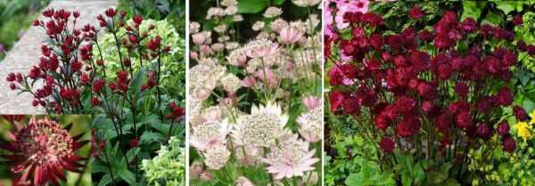 - Астранция (Astrāntia) или Звездовка. Многолетнее растение семейства зонтичных. Хорошо приспособлено к жизни под деревьями, так что можно сажать в глубокой тени. Переносит любые почвы, но лучше всего себя чувствует на питательных и достаточно увлажненных. Цветет все лето, без пересадки обходятся до 12 лет. Листья крупные, глубоко разрезанные. Цветы — белые, красные, пурпурные, розовые. Представляют собой зонтик, состоящий из множества мелких цветов, окруженных листочками обертки. Цветы и обертка могут совпадать по цвету, но чаще отличаются оттенком. Наиболее популярные виды — астранция крупная (Astrantia major) и астранция наибольшая (Astrantia maxima).