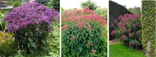 - Посконник(Eupatorium) Влаголюбивое высокорослое многолетнее растение (70-160 см). Предпочитает рыхлые плодородные почвы. Лучше растет на солнечных местах, но выносит тень и полутень. Цветет все лето, цветки собраны в сложный щиток метельчатый или кистевидный. Окраска — от белого, до пурпурного. Чаще встречается Посконник пятнистый (Eupatorium maculatum) и пурпурный (Eupatorium purpureum).