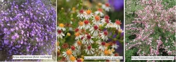 - Астра вересковая (Aster ericoides). Компактный высокорослый вид — до 1 метра в высоту. Цветы многочисленные, мелкие — до 1 см. Лепестки узкие, белого или розоватого тона, серединка трубчатая, разных оттенков.