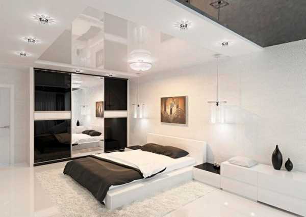 Черно-белый интерьер спальни смотрится стильно и современно. Наиболее частый вариант комбинаторики этих двух контрастных цветов – черная мебель на белом фоне отделки. Но многим современным дизайнерам и домовладельцам такой вариант кажется скучноватым и в ход идут черно-белый орнамент и оригинальный рисунок текстиля, коврового покрытия и сочетание темного и светлого в исполнении осветительных приборов и декоративных элементов.
