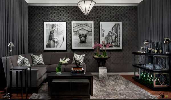 Оригинальная идея для гостиной – использование черных обоев с тиснением и велюровой обивки кресел с одинаковым рисунком. Безусловно, для такого активного применения черного цвета в интерьер необходимо серьезное разбавление дизайна светлыми пятнами – белоснежной окантовкой окон и камина, зеркалами, светлым ковровым покрытием.