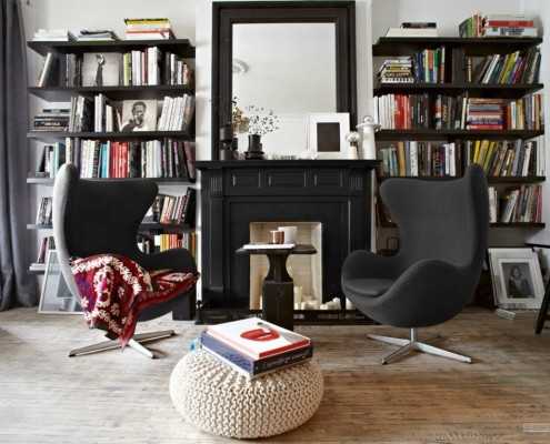 Если монолитная система хранения во всю стену, да еще и черного цвета – это слишком кардинальный дизайнерский ход для вас, то попробуйте использовать открытые полки для хранения книг и прочих мелочей в гостиной. Расположенные по оби стороны от камина (в оформлении которого также использован черный цвет) полки привнесут симметрию в помещение, не говоря уже о функциональной стороне вопроса.