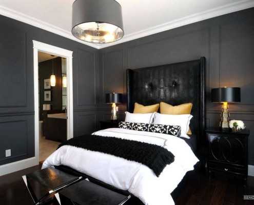 В наши дни в магазинах готовых решений для спальни не составит труда найти вариант в черном исполнении. Мебельный гарнитур цвета венге, состоящий из кровати и прикроватных тумбочек, шкафа или высокого комода, роскошно смотрится в помещении со светлой отделкой. Для привнесения оригинальности в оформление комнаты для сна и отдыха можно использовать обои с черно-белым рисунком для оформления акцентной стены.
