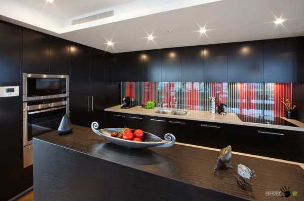 В современных дизайн-проектах кухонных помещений черный цвет легко можно встретить во встроенных бытовых приборах, а вот исполнение большого мебельного гарнитура в темных тонах – редкая изюминка интерьера. Все-таки кухня – комната с высоким уровнем загрязнения, а ухаживать за черными поверхностями непросто – на них видны даже следы от капель воды. Но дополнительные затраты времени на уборку – ничто по сравнению с современным, оригинальным образом кухонного пространства.