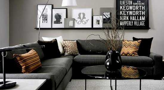 Посредником между черным и белым цветом в интерьер могут стать различные оттенки серого. Мягкая мебель с черной обивкой будет контрастно смотреться в помещении гостиной, отделанной с помощью белого и серого цвета. Для создания более гармоничного интерьера лучше продублировать эти тона в дополнительной меблировке, ковровом покрытии, шторах на окнах или декоре.