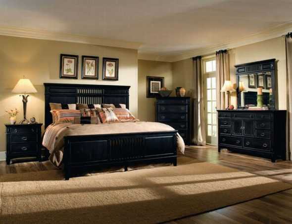 Бежевый цвет, казалось бы, гармонирует со светлой мебелью в интерьере, но не в этот раз. На фото пример сочетания бежевого цвета с полностью черной кроватью. Черная кровать здесь единственный черный элемент, но дополняет его темная коричневая тумба. Стены выкрашены в бежевый цвет, потолок – в белый. Это легко могут быть обои (на фото не разобрать), поэтому берите себе на заметку эту идею.
